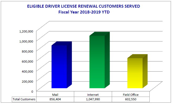 Over six million customers renewed their driver license in FY 2018-2019. Of those customers, over 2.5 million were eligible to renew via an alternative service channel. The chart below provides a breakdown of the method used by these eligible customers to renew their driver license. Field Office totals reflect those customers who chose to renew their driver license in a field office, even though they were eligible to renew using an alternative service channel.