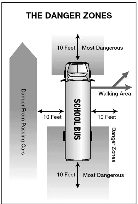 - Define the danger zone. How far does the danger zone extend around the bus?