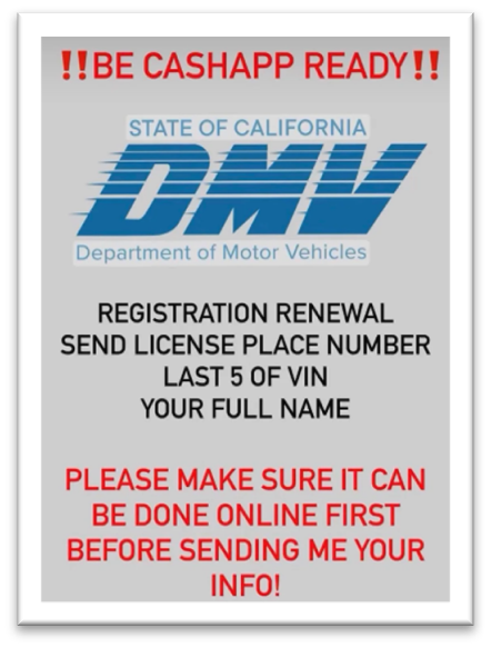 The latest scam uses social media posts to offer 50% off vehicle registration renewal fees. The posts request payment through online payment applications and request customers’ license plate, Vehicle Identification Number and the customer’s full name.